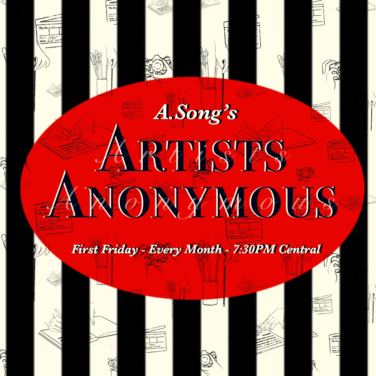 A. Song’s Artists Anonymous occurs on the first Friday of every month, 7:30PM Central.